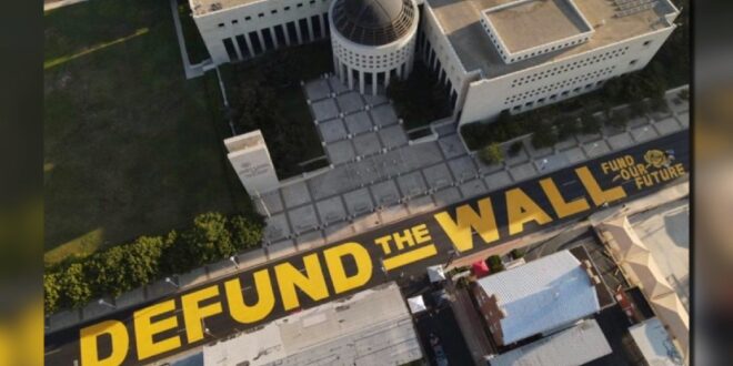 La leyenda “Defund the Wall” quedó escrita con letras de grandes dimensiones y con un vistoso color amarillo para simbolizar la lucha de la Coalición Contra el Muro en Laredo, una organización que a la larga terminó por ganar una batalla legal contra el gobierno federal impidiendo la construcción de un muro en Laredo.
